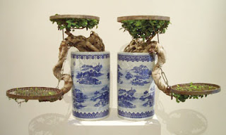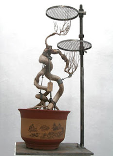 I never thought about Chinese Bonsai as a tree torture and I was very surprised to see a series of bonsai by Chinese artist Shen Shaomin presented at Frey Norris Gallery. Shen shows them trussed and tugged by the thumbscrew brackets, collars and barricades that engineer their growth.