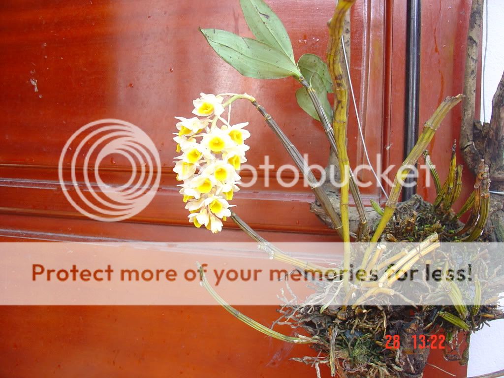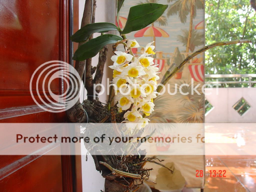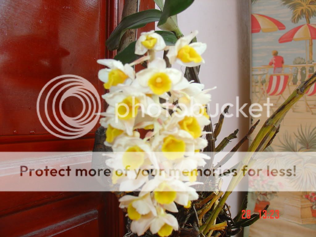 Thủy tiên cam Dendrobium thyrsiflorum .Loại này thích ẩm và tránh nắng trực tiếp.Bạn thử bỏ giá trể củ trồng lại vào dớn hoặc trái dừa khô :>