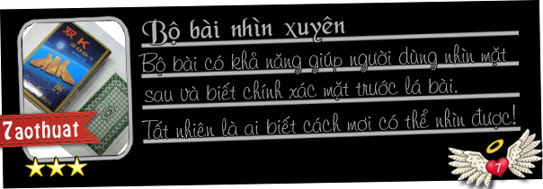 Mô tả: Đây là một bộ bài đặc biệt, có thể nhìn xuyên qua tất cả các lá bài nếu có cách,